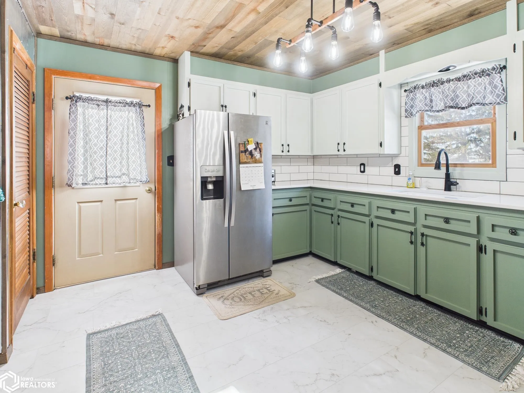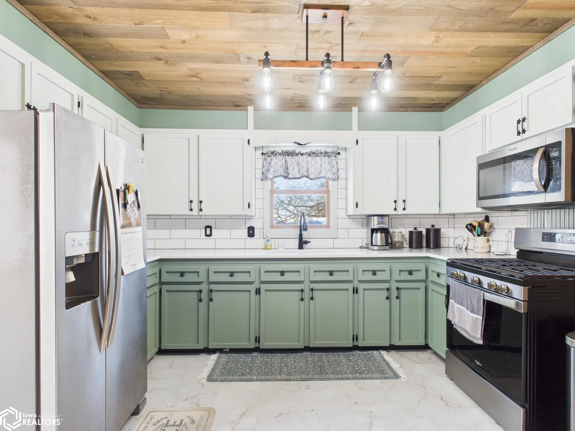 Charming 2 bed, 1.5 bath ranch featuring a bright living/dining room combo with original hardwood floors. The kitchen was thoughtfully updated in 2024-2025 with quartz countertops, new flooring and a warm rustic wood ceiling that adds character. All appliances stay; the gas stove runs off an owner-owned propane tank while the rest of the home is electric. The full bathroom was refreshed in 2022 and includes a cabinet that stays, while the ensuite half bath was updated in 2024 and offers added convenience. Additional highlights include a durable metal roof installed in 2021, main-floor laundry, and a full unfinished basement providing a blank canvas for future expansion or customization. Enjoy fiberoptic internet and a large deck for entertaining. Heating and cooling were replaced in 2023.