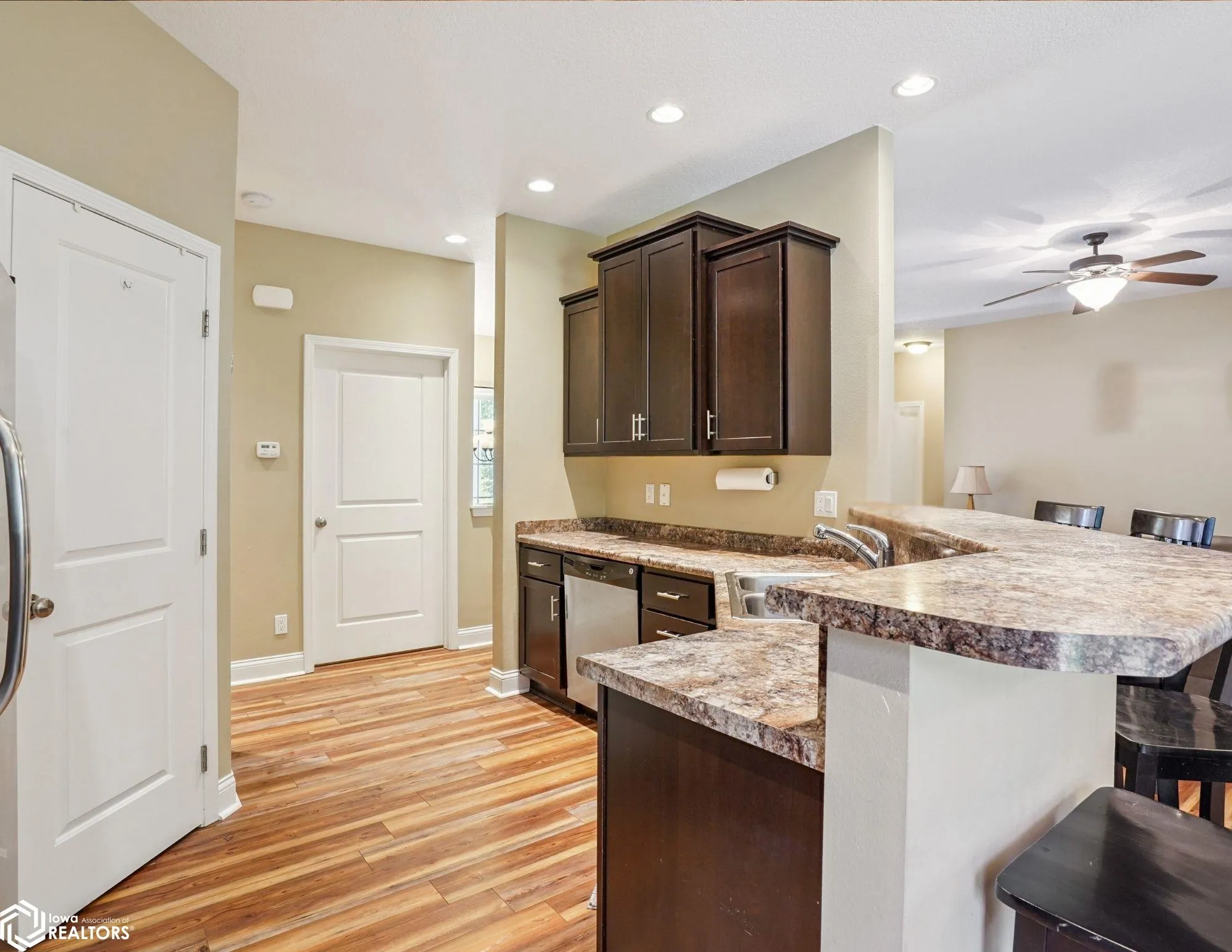 From the moment you arrive, this stunning 5-bedroom, 3-bathroom residence stands out with undeniable curb appeal and an inviting presence. Tucked away on a quiet cul-de-sac in one of Nevada’s most sought-after neighborhoods, all while being just a short commute to Ames, Ankeny, and Des Moines. Inside, you’ll be greeted by soaring ceilings, abundant natural light, and a wide-open floor plan that was made for both everyday living and entertaining. The heart of the home is the beautifully designed kitchen, featuring ample cabinetry, a large pantry, plenty of counter space, and direct access to the backyard through sliding glass doors—perfect for morning coffee, backyard BBQs, or peaceful evenings under the stars. Step outside to your private patio and relax, or watch the kids play. The main floor primary suite is a true retreat, offering a generously sized bedroom, a private full bathroom, and peaceful views of the yard. Two additional bedrooms and another full bathroom on the main level provide ideal space for family, guests, or even a home office. The main floor also features a convenient laundry room and easy access to a well-maintained, attached two-car garage. The lower level continues to impress with a large family room—perfect for a home theater, game night, or kids’ play zone. You’ll also find two more generously sized bedrooms, a stylish ¾ bathroom, and a second laundry area paired with a utility room and plenty of storage.