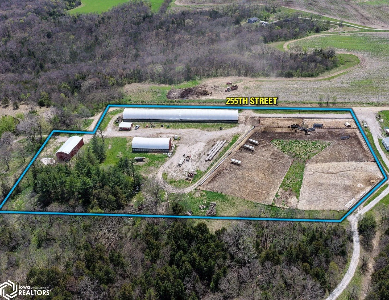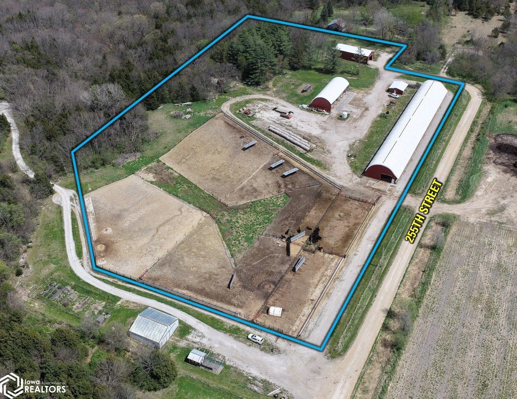 Guthrie County, Iowa Commercial Cattle Feeding Facility – This turn-key commercial cattle feeding facility is located in east-central Guthrie County, Iowa, approximately five miles southeast of Panora, Iowa. Situated within a well-established livestock and row-crop production region, this feeding facility has been developed with efficiency, durability, and cattle performance in mind. This property offers modern improvements and a highly functional layout suitable for finishing cattle, backgrounding programs, or continued breeding and calving use. The facility features well-defined feed alleys for feeding, efficient indoor and outdoor pen layout for handling various weights of cattle, well-placed gates for efficient cattle processing and low-stress cattle handling, and concrete infrastructure that reduces weather impacts. At the core of the operation is a 43’ x 320’ hoop building, built in 2016, with eight indoor pens designed for year-round use. The hoop barn provides excellent natural ventilation and lighting, along with 12’ concrete feeding aprons, high-capacity high-back feed bunks, metal pipe fencing, and Ritchie automatic waterers shared between every two pens. The barn includes 320 feet of continuous bunk line along the southern side of the building, providing weather-protected feeding strategies during adverse conditions.