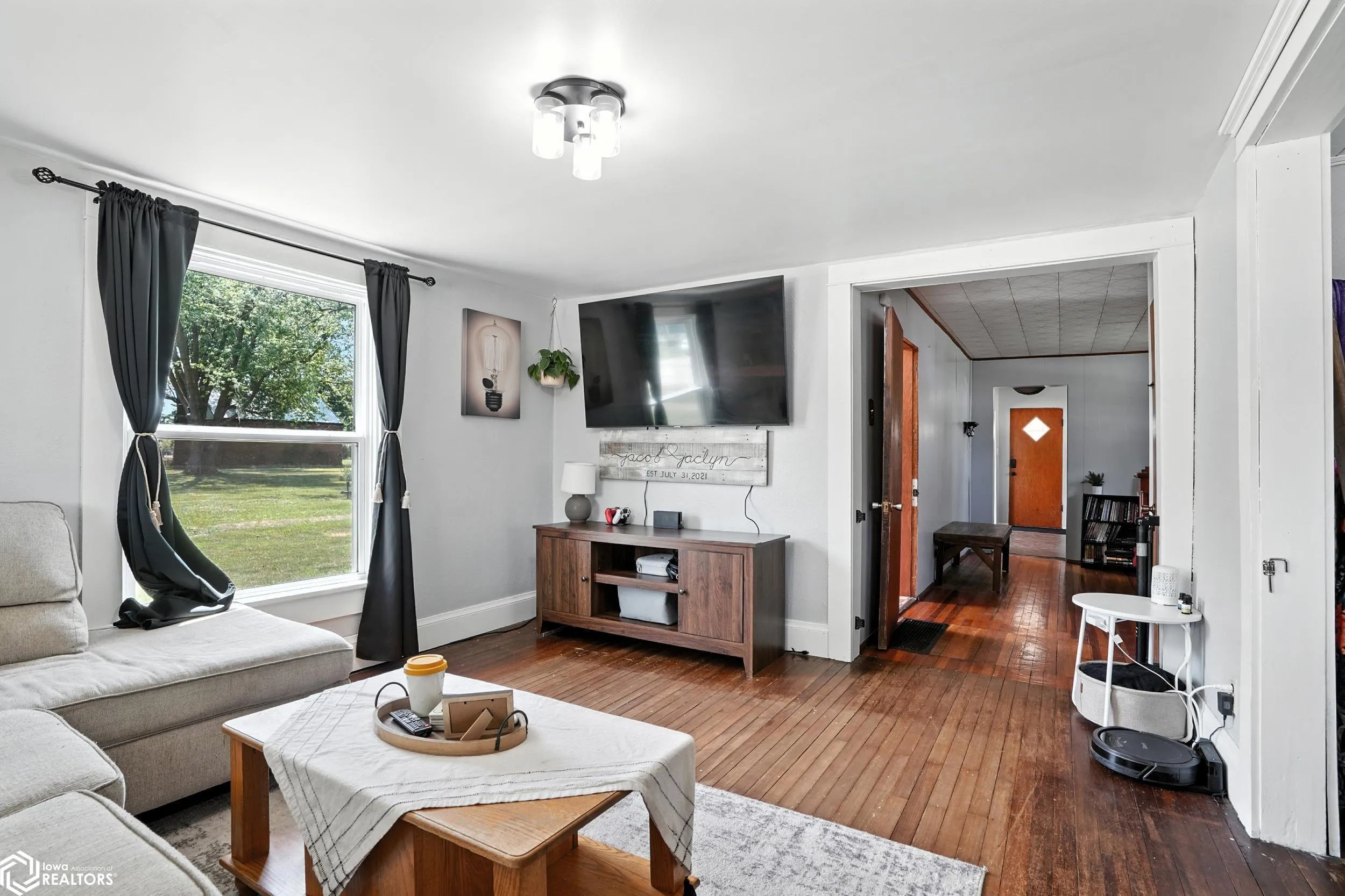 Large 4 Bedroom home with 1.5 baths on a corner lot in family friendly Keota. This home has a spacious main floor with a staircase leading to 4 bedrooms and full bathroom. Outside we have a private patio with mature trees and a fence leading to a large 33×26 garage with workshop that had a new metal roof in 2024. This home has had many updates including newer water and sewer lines, new plumbing in the bathrooms along with sinks and vanity, 9 new windows in 2024, new flooring in master bedroom, guest bedroom and upper bathroom, living room ceiling replaced with drywall, fresh paint and a new countertop in the kitchen. Roof was replaced in 2018. Option to buy the neighboring lot that holds the second garage, currently listed separately.